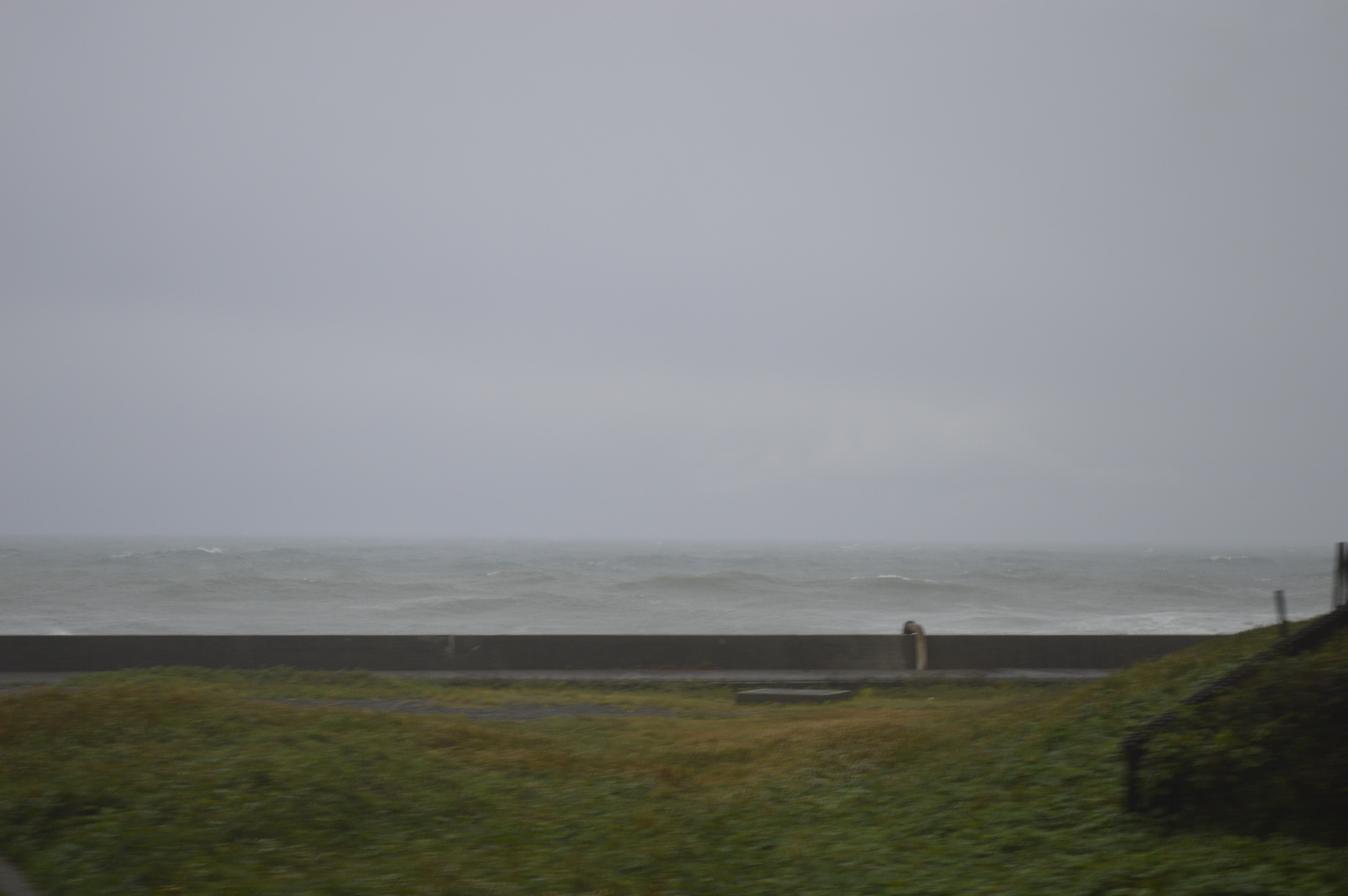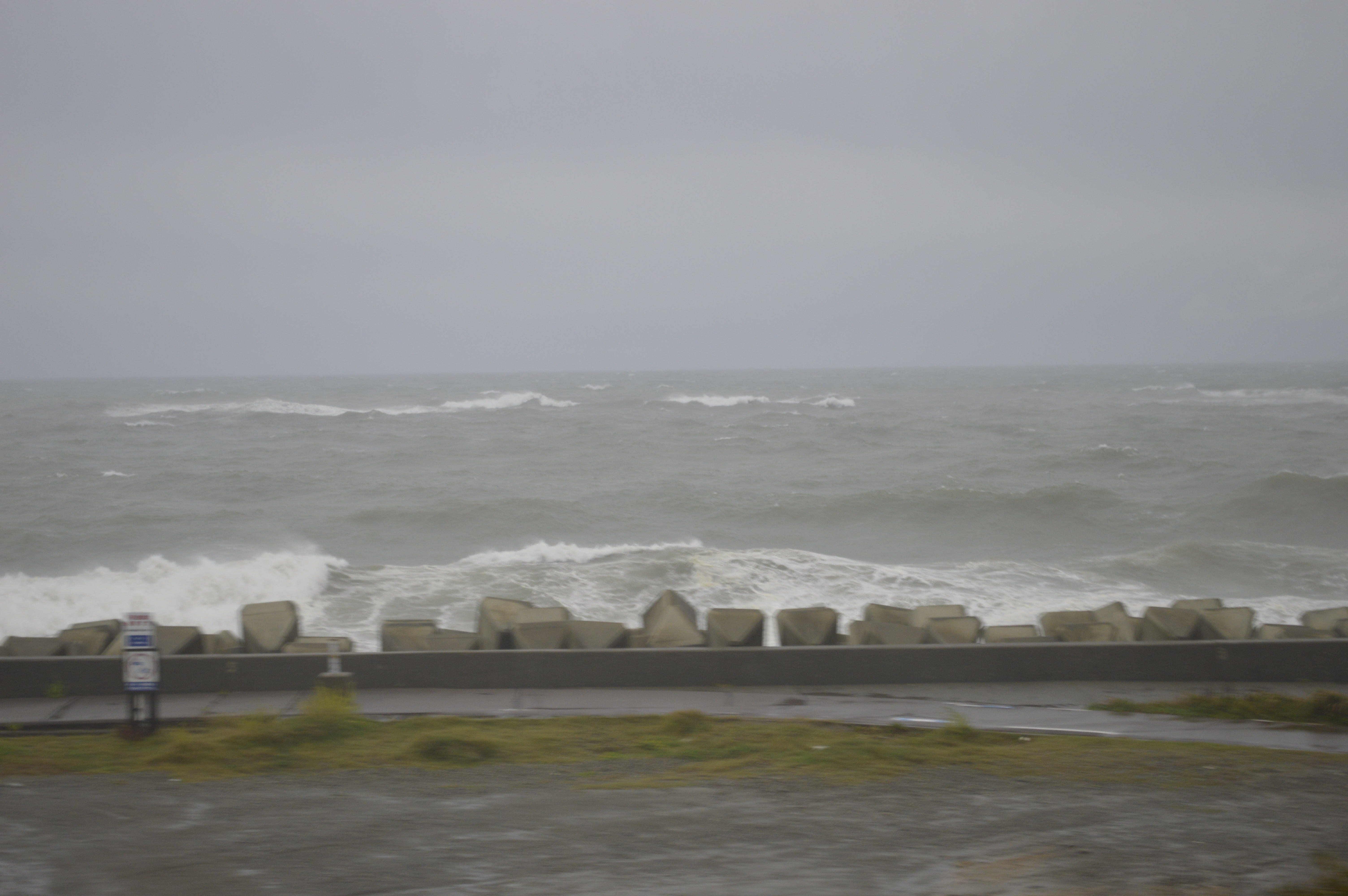 12:00頃の北陸自動車道から見えた日本海。雨は小降りですが、風が強くて波も高く打っています。