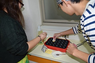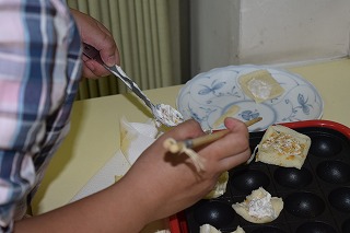 たこ焼き器に切り取った食パンがチョコを包んでセットされています。