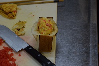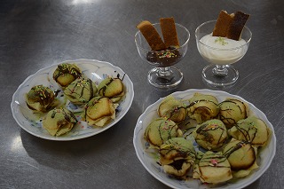 Bチーム 完成しました「3時のおやつたこやきパン」 まるめた食パンの中にチョコとクリームを入れてたこ焼き器で焼きました。パンの耳まで無駄にしないメニュー。こちらも、おいしそう!