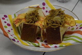 Aチーム 完成しました。「オムそばパン」 半分に切った食パンの中にふっくらオムレツとヤキソバが入っています。高校生にはうれしいボリューム、見た目も良くて、おいしそう!