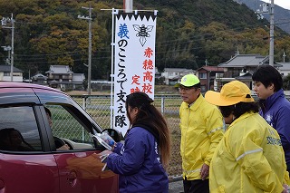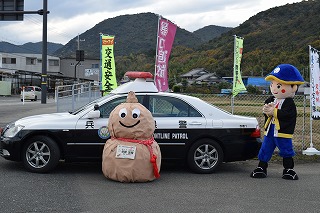 交通安全ストラップ配布 2015年12月1日未分類admin いよいよ今年も後1ヶ月を切りましたね! 年末の交通安全週間も始まりましたので、生徒だけでなく教員も事故や交通違反をしないように注意していきます。 今日は、赤定と赤穂特別支援学校と赤穂警察、交通安全協会の方々で交通安全の祈願をこめたひょうたんストラップを配布しました。 パトカーを背景に我が校のマスコット「赤穂 定時(あこう さだとき)」も記念写真。 年末の何かと忙しい時、無事故で年越しを迎えれるようにしていきましょう!
