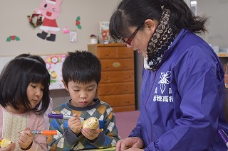 赤穂幼稚園でひょうたんの絵付け体験 2015年12月11日未分類admin 今日の昼ごろ、有志の生徒たちが赤穂幼稚園にひょうたんを持っていき、絵付け体験教室を行いました。 園児も静かに座って赤定の生徒たちの説明を聞いています。 隣の子の絵が気になるのか、のぞき見をしていました。 定時くん、園児に大人気です。 今後も、機会を見つけてこのようなボランティア活動を行っていきたいです。
