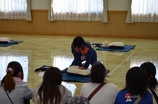 現職の消防士の方に講師をしていただき、心肺蘇生法やAEDの使用方法などを人形相手に実施しました。