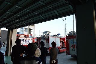 署内の見学を行っています。通信指令設備や消防車など実際の現場で使われているものについて説明していだきました。