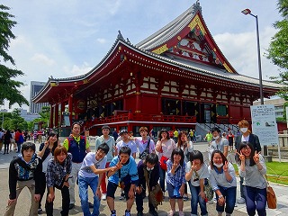 雷おこし製造体験前に、浅草寺を背景に、集合写真を撮りました。