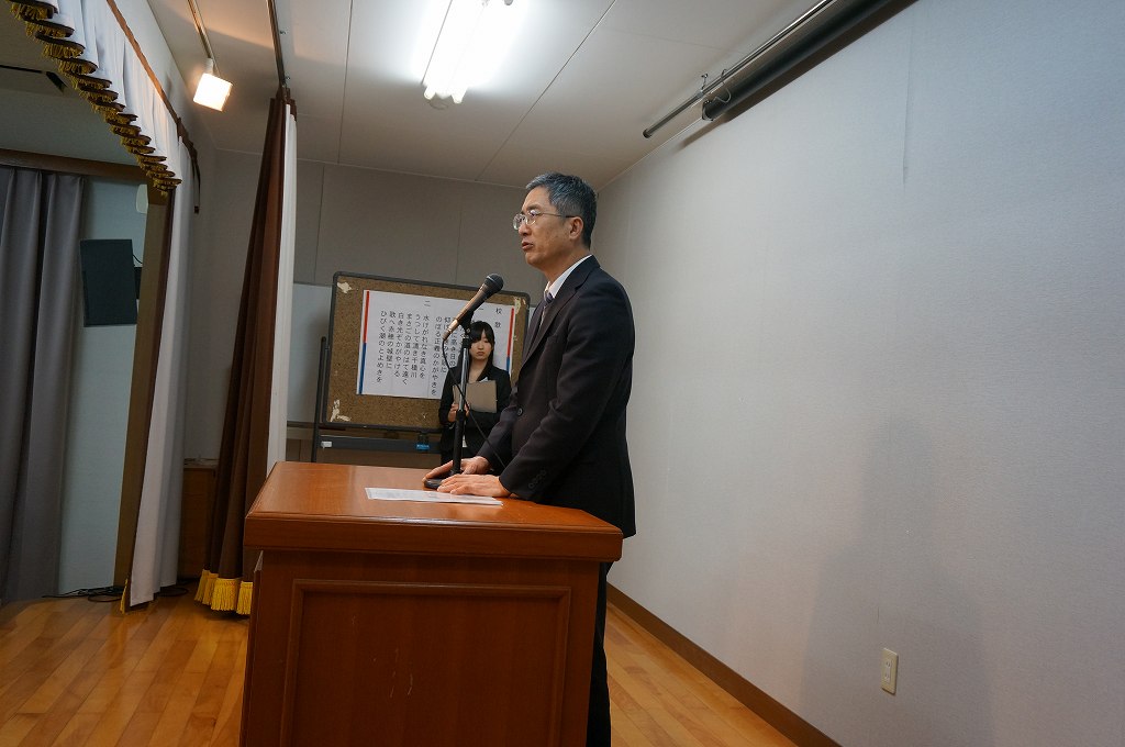 はじめに校長先生のお話があり、その後校歌斉唱、表彰伝達が行われました。