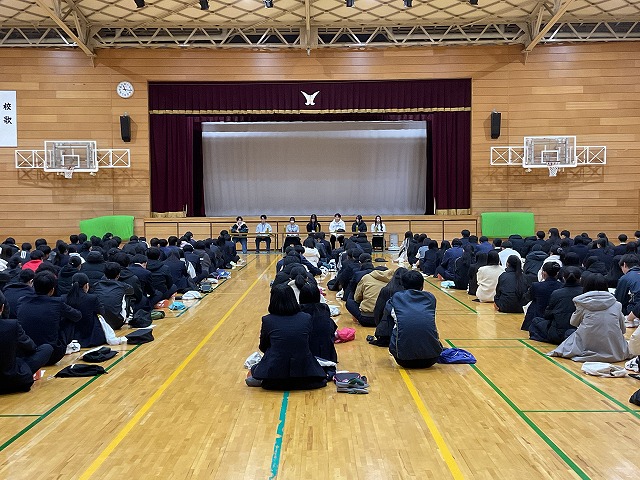 1、2年生(77、76期生)を対象に、大学生やこれから大学に進学する74、75期生の先輩7名が進路に関する話をしてくれました。高校生活の過ごし方、進路をどのように決めたか、大学での生活など、後輩を激励する熱のこもったお話でした。