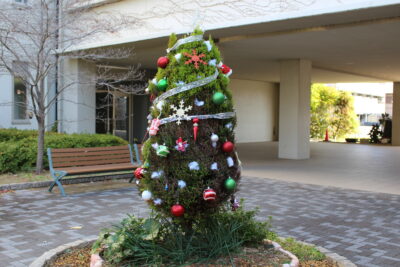 本校中庭にクリスマスツリーが設置され、校内を彩っています。設置くださったのは校務員の池田さんです。日ごろから季節感を大切に、四季に合わせて中庭を手入れしてくださっています。この時期、校内は一層華やかな雰囲気に包まれています。