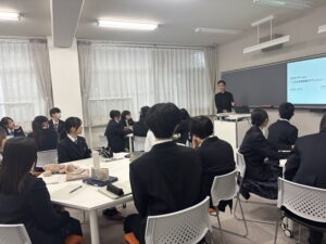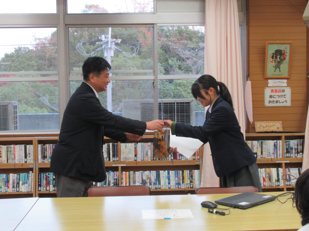 その他の発表者は、1年石元杏樹さんの「54字の物語」、1年正井悠人さんの「死亡遊戯で飯を食う。」、1年松原遥斗さんの「告白」、1年Hさんの「白夜行」でした。1年生が5人も参加しました。来年以降が楽しみです。