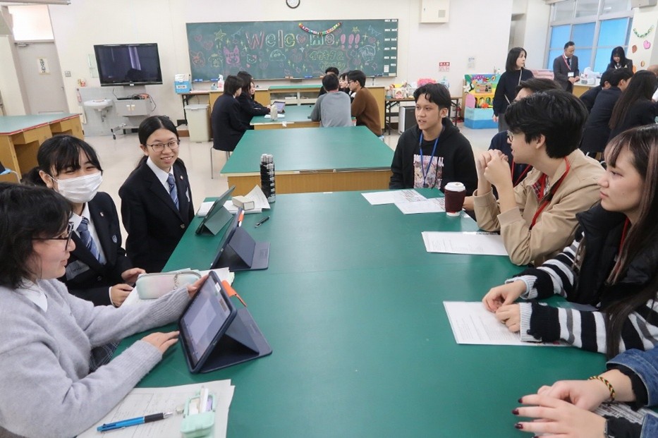 11月7日(金)のナレッジLabで、兵庫県立大学国際商経学部の留学生40名(アジア圏を中心とした10か国あまりの留学生)と交流授業を実施しました。1学期に作成した「街レポ動画」を英語で紹介し、お互いに意見交換をしました。最初は緊張した様子でしたが、次第に打ち解けて和やかな雰囲気に包まれ、良い交流ができました