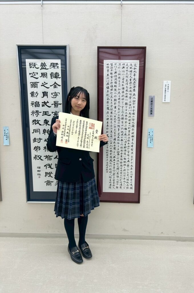 先日行われました第49回兵庫県高等学校総合文化祭書道展に出品しました1年天羽恵莉菜さんの作品(臨蘭亭序)が、近畿総文推薦賞を受賞しました。これにより来年度行われる近畿高等学校総合文化祭兵庫大会に出場することが決まりました。1年生から近畿総文を経験できること大変光栄に思います。今後も精一杯作品制作に励みます。応援よろしくお願い致します。