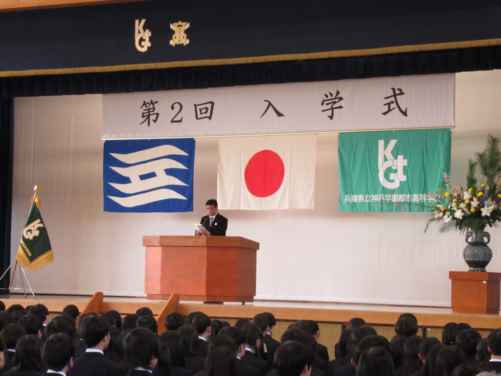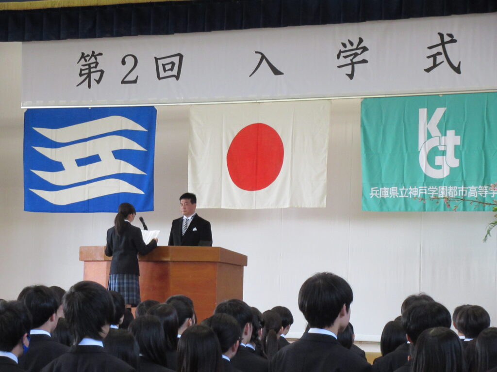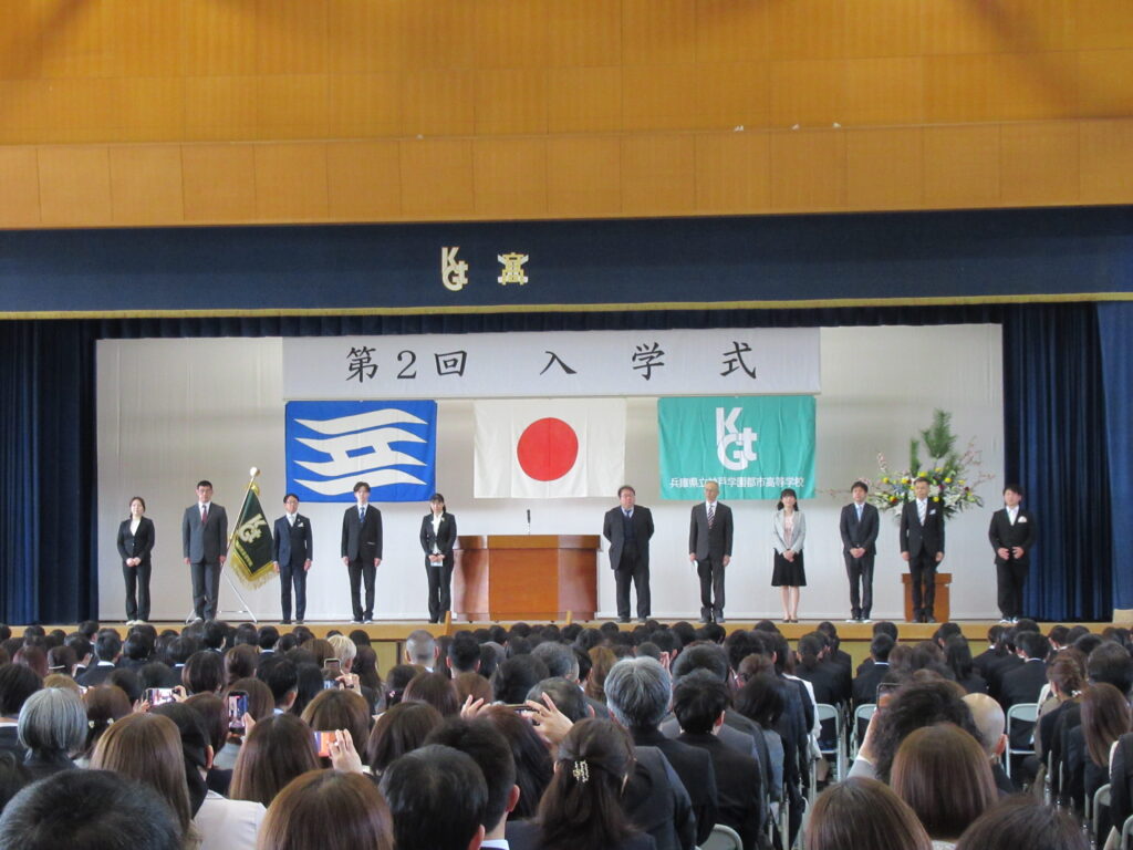 第2回入学式を4月8日に本校体育館にて挙行し、新入生299名を迎えました。当日は多くの保護者・来賓の皆様にご参列いただき、厳かな雰囲気の中で式が進みました。入学許可、学校長式辞、新入生代表宣誓に続き、来賓紹介や祝詞披露、校歌斉唱を行いました。また、学年団紹介と学年主任挨拶も行い、新入生の新たな高校生活のスタートを祝いました。