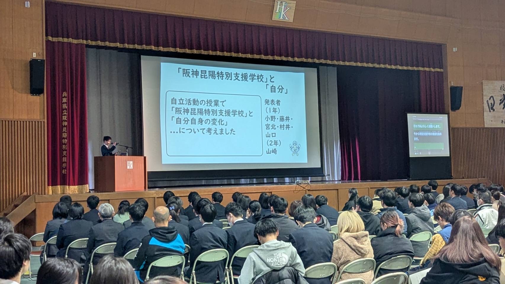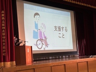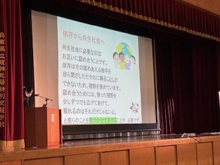 1・2・3部の代表が「ノーマライゼーション」の取組について発表し、あわせて「地域社会への支援」「対人援助」の授業を受講している生徒と特別支援の生徒が授業等の取組を発表しました。