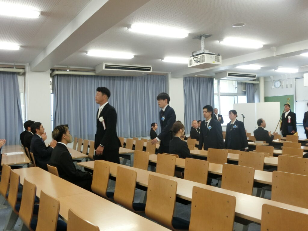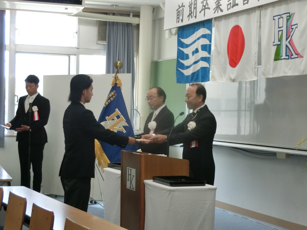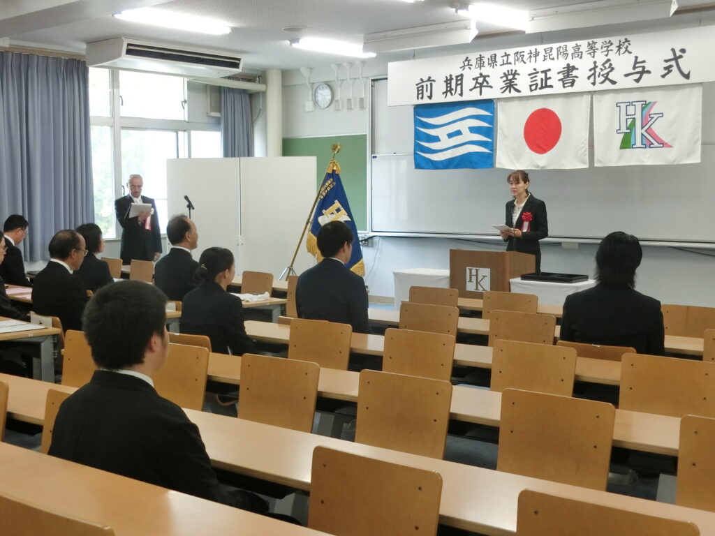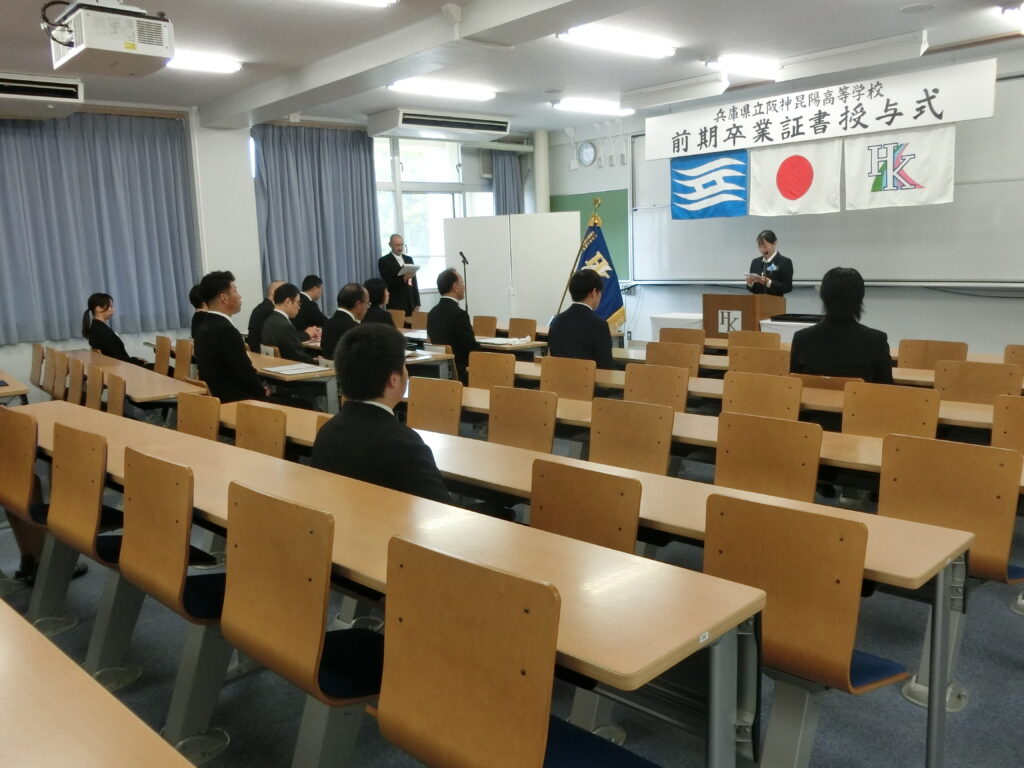 前期 卒業証書授与式(高校) 2025年9月30日 hanshinkoya_hs2 コメントする 9/30(火)10:00から来賓にPTA会長及び役員の方々、同窓会長をお招きし、大講義室で卒業式を行いました。 卒業証書授与 来賓祝辞 卒業生のことば 卒業生退場 廊下の飾りつけ 教室の飾りつけ 前期の卒業生7名が、晴れて本校を巣立ちました。式辞、祝辞につづいての卒業生の言葉は、重みのある言葉でした。 卒業生の前途が輝けるものになることを祈念しています。