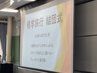修学旅行 結団式(高校) 2025年10月28日 hanshinkoya_hs2 コメントする 10/27(月)5・6限、1・2・3部合同で修学旅行の結団式を行いました。28日から出発する修学旅行に向けての最終確認です。出発から帰着まで、注意点を再確認します。 出発後の修学旅行の様子はブログで随時アップしていきます。