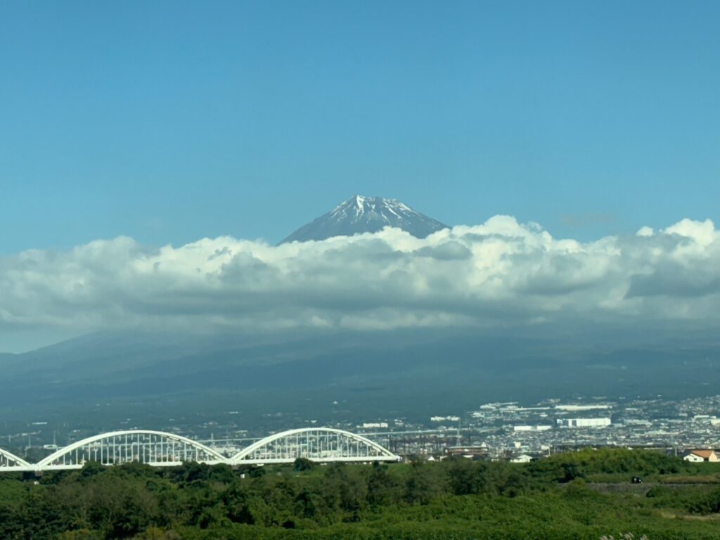 修学旅行1日目 ③ 富士山 2025年10月28日 hanshinkoya_hs2 コメントする 現在、東京駅に向かって進行中の「のぞみ」、静岡を通過後、見えてきました富士山が!今日は裾野に雲がかかってはいましたが、うっすら雪化粧の頂上付近がくっきりと見え、私たちの修学旅行を見守ってくれているようでした。 東京まで、あと30分ほどです。