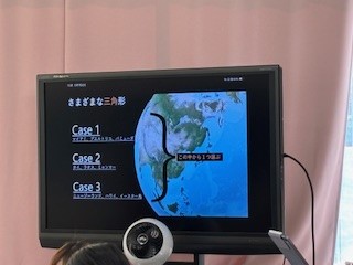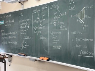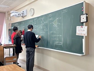 続いて数学の「数学Ⅰb」の授業。こちらは三角形の面積に関する単元を学びます。先生からのお題は「さまざまな三角形」。地球上の3地点を結んだ三角形の面積を実際の距離に基づいて導き出します。Case1はマイアミ、プエルトリコ、バミューダ、Case2はタイ、ラオス、ミャンマー、Case3はニュージーランド、ハワイ、イースター島。班に分かれてCaseを選び、角度や辺の長さは測定アプリを用いて測り、計算です。各班とも工夫をしながら答えを導きだし、班ごとに黒板に記入して、最後に発表です。