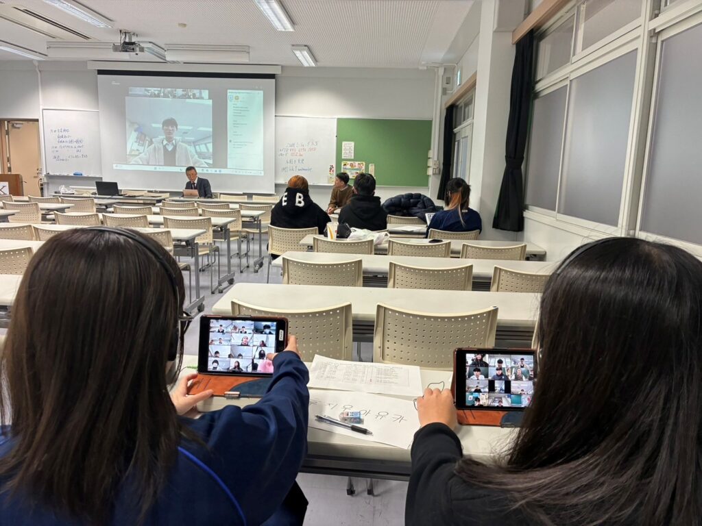 12月17日(水)15:00~16:00、韓国の禾谷高校の生徒と本校の生徒がオンラインでの交流を行いました。まず、両校の先生方の挨拶にはじまり、Zoomのブレイクアウトルームで、グループに分かれて交流を行います。交流では自己紹介、お互いの国の好きなところ、その他自由に質疑を行い、活発な意見交換ができました。