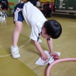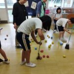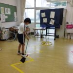 グループ学習(自立活動)Ⅲの時間にグループⅢでは、ほうきや雑巾の使い方をゲームを通して学習しました。ジグザグに貼られたテープに沿ってほうきでボールを掃いたり、雑巾でボールをゴールまで運んだりしました。3色のボールを色分けしながら掃くゲームではみんな集中して最後まで頑張り、掃除道具の使い方がとても上手になりました。