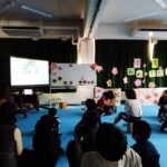 基礎Dグループは、週2回(火・金)大型絵本や紙芝居、ペープサートにエプロンシアターなどで楽しいお話を見たり聞いたりした後、そのお話にちなんだ題材で様々な教材に触ったり握ったりと遊びを通して学習しています。おおきなかぶでは、掛け声とともに友達と一緒につるに見立てた紐を引っ張り、物語の雰囲気を体験したり、大きな野菜を引き上げて大根や人参などの野菜に触れ、匂いや感触を味わったりしました。クリスマスのおはなしでは、仕掛けの箱のリボンを握りほどける様子を目で追ったり、中からキャラクターが飛び出すとびっくりしたり笑ったりして楽しく学習しました。