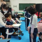 グループ学習(自立活動)の時間に、グループⅠでは友達とコミュニケーションを取りながら協力して行う活動に取り組んでいます。今回の「調理」をテーマにした学習では、卵を割る、混ぜる、焼けた卵を切るなど様々な役割を自分たちで分担し、協力して卵焼きを入れた巻きずしを作りました。友達が活動している時には、アドバイスをするなど児童同士で協力する場面が増えてきました。