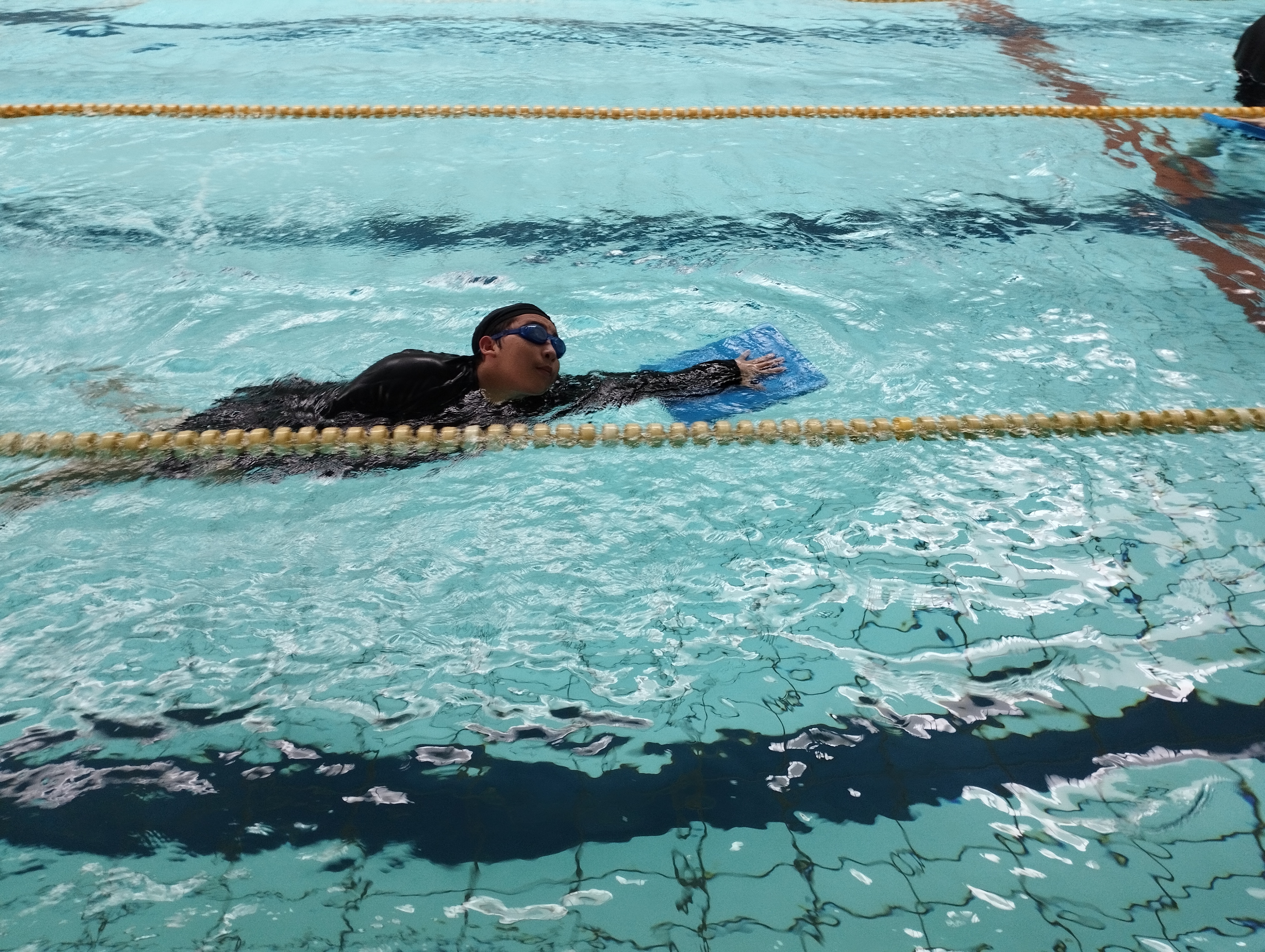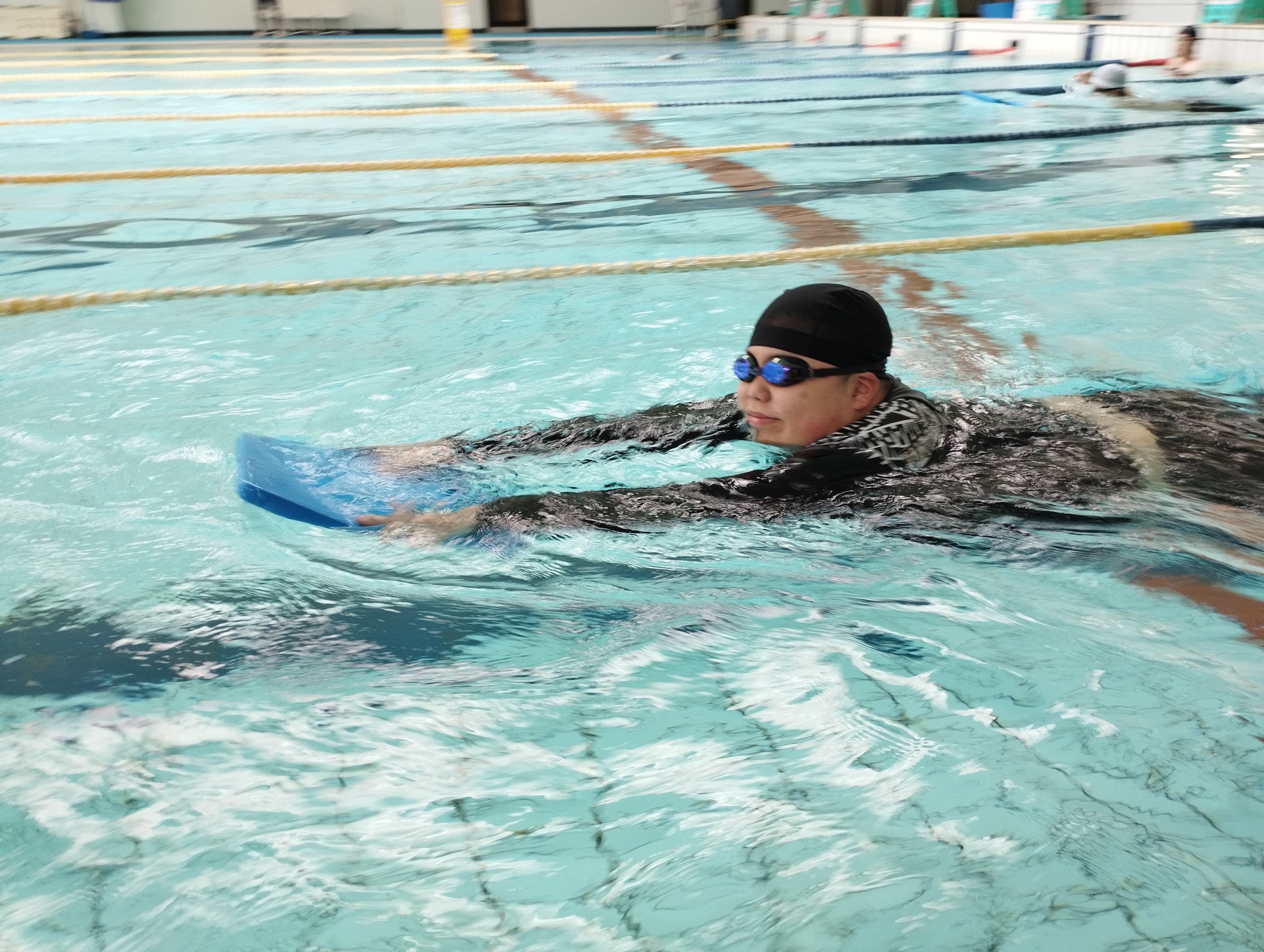 1回目から3か月ぶりの水泳学習でしたが、ルールを守って授業に参加することができました。前回、小プールで活動していた生徒が、勇気を出して大プールでの活動にチャレンジをしたり、水に顔をつけることを挑戦し、頑張っている生徒がいたりなど、それぞれで一歩踏み出す姿が見られました。みんなでプールの中をぐるぐると歩いて、水の抵抗を感じたり、流れに身を任せて浮かんでみたりして、水中での感覚を楽しむことができました。