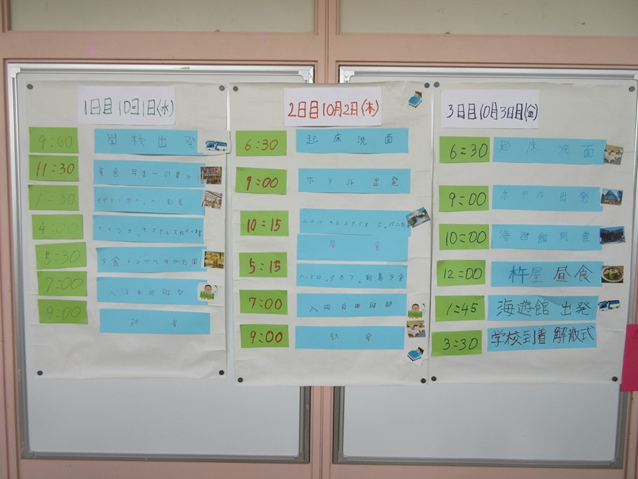 学習では、旅行のめあてを確認したり、大阪の地理について学んだり、行程表を作成したりしています。 3年生全員で役割分担をし、協力しながら準備を進めています。
