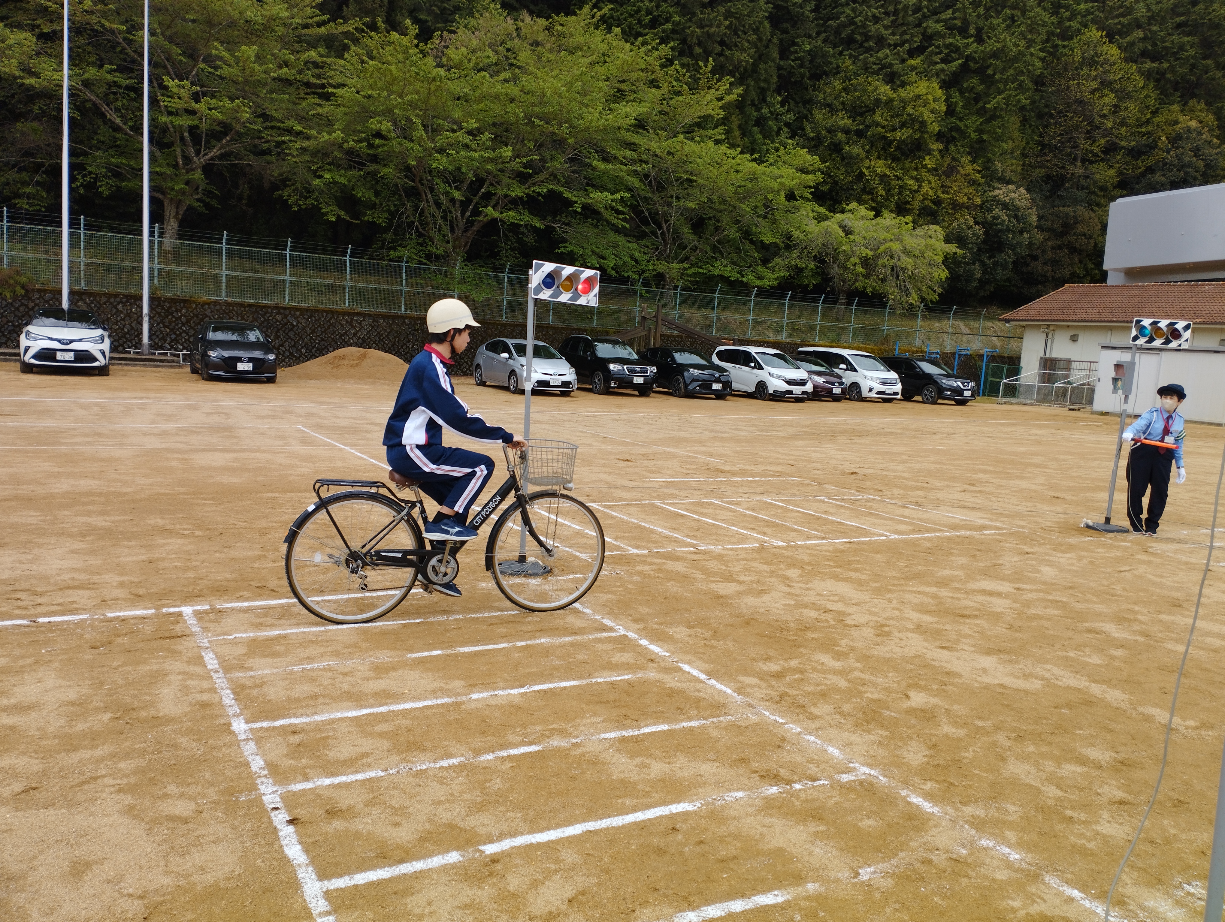 4/24(木)に交通安全教室を実施しました。講師として、丹波警察署、国領駐在所、交通指導員の方々に来ていただき、交通ルールについて講話をしていただきました。その後、自転車グループはグラウンドのコースで自転車実技を行い、安全確認や交差点の通行方法を学びました。歩行グループは校内グループ、校外グループに分かれ、道路の横断や右側通行などの練習を行いました。