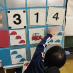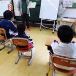 絵本の読み聞かせ、3グループに分かれた集団学習(具体物と数字、色と形のマトリクス)、