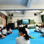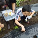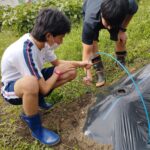 大根、白菜、小松菜、じゃがいもなどの野菜を植えました。そして、外部専門家の宮脇先生に来校していただき、今回は、グラスファイバーを使って野菜のお家づくりをしました。初めて触れるグラスファイバーに生徒は興味津々でした。2人1組になり各畝に設置をすることができました。10月末に透明のビニールシートを張って完成させる予定です。