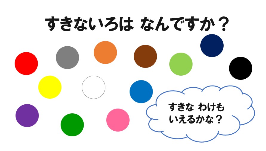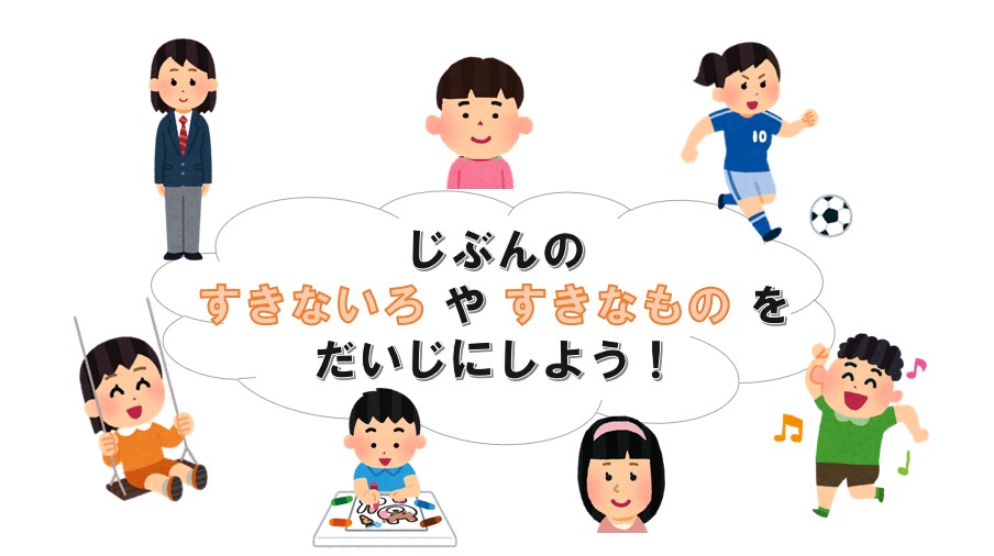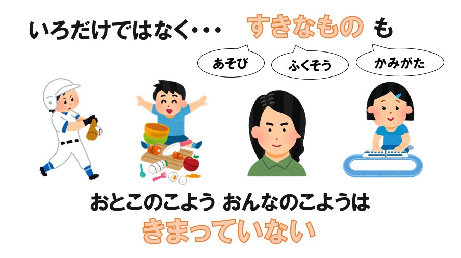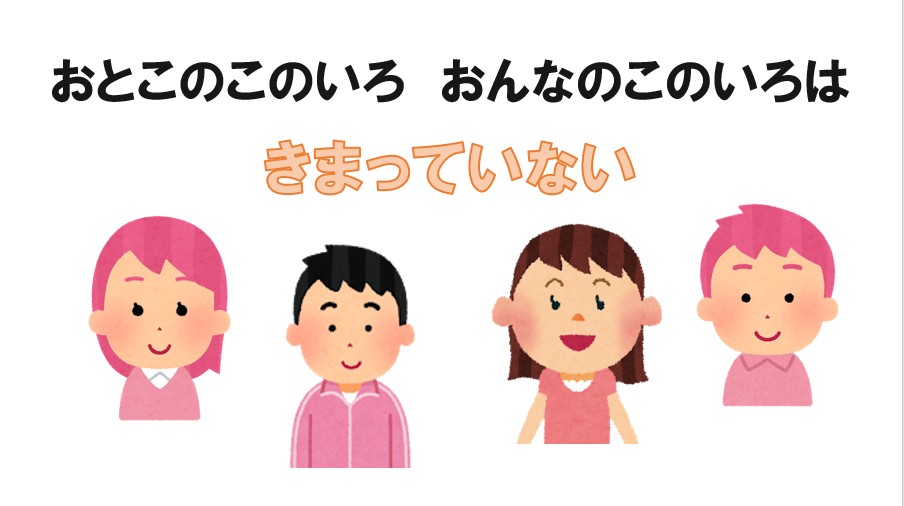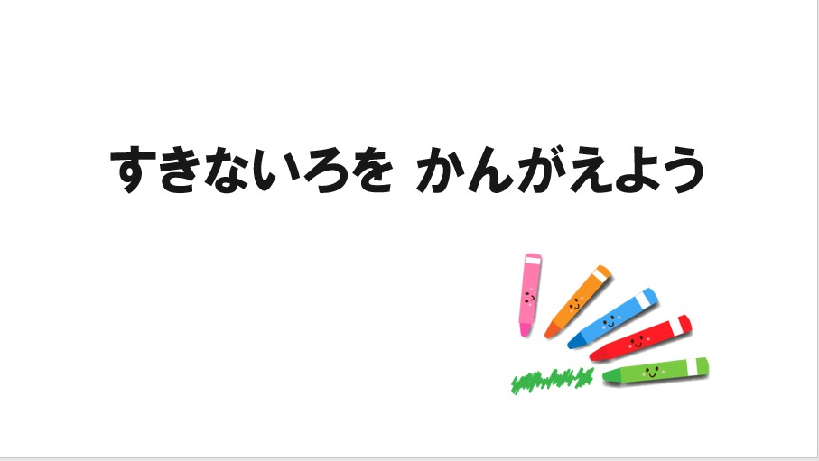 ジェンダーに対する誤った思い込みや決めつけに気付き、正しい知識を得ることを目標に、自分の好きな色を表現したり、友達とお互いの好きな色を認め合ったりする内容でした。