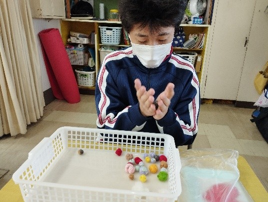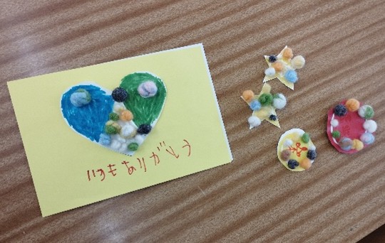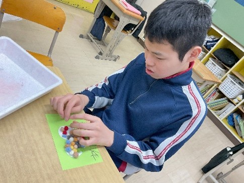 家庭科では、生活を送る上で様々な人に支えられていることを学び、身近な人に感謝を伝えるためにメッセージカードづくりやプレゼントづくりを行いました。羊毛フェルトを丸めてフェルトボールつくり、メッセージカードに貼ったりマグネットにしたりしました。相手を思い浮かべて配色を考えたり、メッセージを書いたりして、心をこめてつくりました。