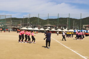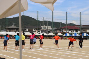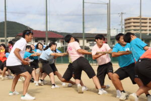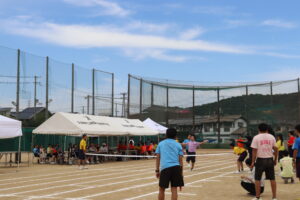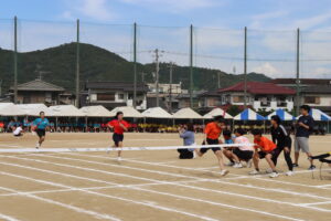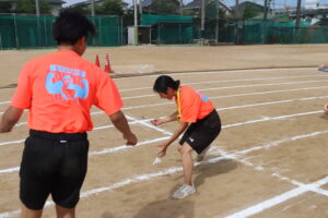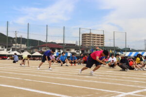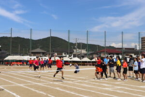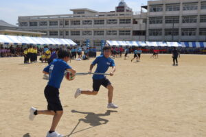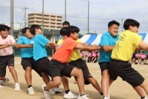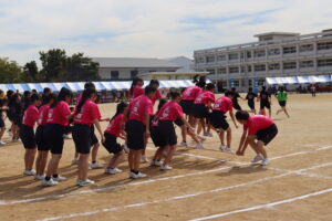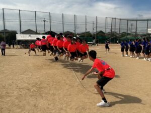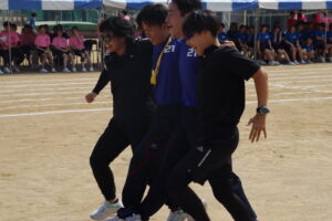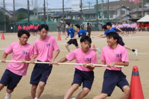 昨年までは陸上競技場で行われていたため、陸上競技種目が多かったのですが、生徒会や体育科教員が、生徒全員が参加できるようバラエティーに富んだ競技を準備しました。また、観覧席も近いことから生徒たちの応援もより一層力が入り、クラスの勝利のために一致団結して競技に取り組んでいました。