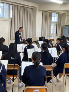 10/25(金)に、プロのクラリネット奏者である小川哲夫氏に来校していただき、酒井格作曲の「たなばた」を使って合奏指導をしていただきました。大学での教授経験やこれまでの演奏家としての経験を通して、これからの活動となるヒントを惜しみなく教えてくださいました。合奏は3時間以上続きましたが、生徒は集中して合奏に取り組み、収穫がいっぱいの有難い時間となりました。ご教授いただいた、「音楽を楽しむ」という気持ちを忘れず、次回のレッスンまでに各々が成長した姿を披露することができるよう、これからも精進していきます。