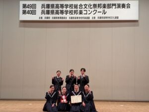 姫路南高校・姫路海稜高校筝曲部は、課題曲「六段の調」と自由曲「和楽器のための三重奏曲」を演奏し、金賞(県2位)を受賞しました。