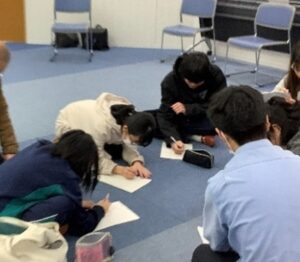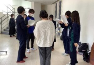違う学校の演劇部員同士が6~7名ずつのグループに分かれ、午前中に練習をし、午後に発表しました。初対面で最初は緊張していた生徒たちでしたが、お互いに演技や演出について意見を出し合ううちにすっかり打ち解け、練習方法を教え合ったり互いの演技を比べたりし、昼休憩にはそれぞれのグループで昼食をとりました。