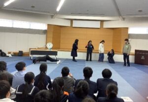 午後の発表では、各グループで工夫を凝らし、緊張の中にも生き生きとした演技が見られました。講師の先生のアドバイスを受けて演じなおすと、動きや間合いが見違えるほどよくなり、見ている生徒から笑いや拍手、感嘆の声が上がりました。最後には同じ台本で先生方も演技を披露しました。