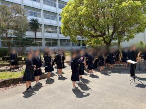 お昼休みに中庭にて、新入生歓迎演奏として「RPG」「ジャパニーズグラフィティ 嵐メドレー」の二曲を披露しました。快晴の中、新入生だけでなく多くの二、三年生や先生方にも教室や廊下の窓から見てもらいました。ありがたいことにアンコールもいただき、急遽でしたが「銀河鉄道999」も演奏しました。新入生の皆さん、これから楽しい姫路海稜高校生活を送ってくださいね!(・・・よければ吹奏楽部にも足を運んでください♪)