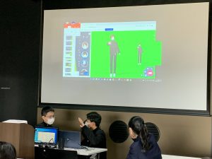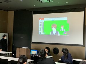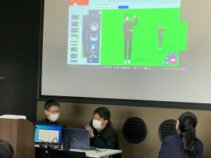 内容:成果発表会の場で、Vtuberの研究をしているチームがデモンストレーションを行いました。カメラの前の人物の動きと、画面の中のキャラクターが連動して動き、マイクから取り込んだ音声を、キャラクターの声に変換して出力しているところを見てもらいながら研究成果の発表を行いました。また、聞き手の人たちにも体験してもらいました。