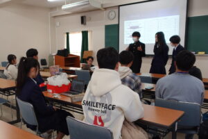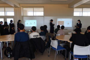 宮城県仙台第三高校の2年3組42名のみなさんが、修学旅行の一環として本校2年国際理学科の生徒たちと探究活動を通した交流活動を行いました。仙台第三高校はSSHⅢ期2年目の学校です。グループに分かれて、本校の生徒が仙台第三高校のみなさんに自身の研究を紹介し、質疑を交わしました。昼食も各グループごとにとり、お互いの研究を紹介するだけでなく、学校の特徴を話し合う姿が見られました。