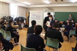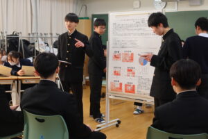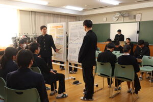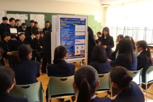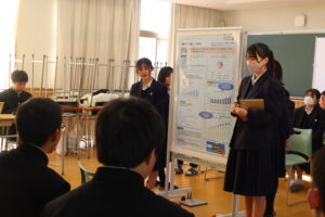 4月から取り組んできた課題研究の成果発表会を実施しました。自然科学、部活動、地方創生、食、ゲームなど幅広い様々なテーマの研究に励んできました。独自に実験をし得たデータを用いて分析をしたチーム、データ分析にAIを使用したチーム、Pythonでクラスタリングをしてデータ分析をしたチーム、実際にアプリを開発したチーム、大学教授に助言指導いただき研究を行ったチームなど、各々が研究の成果をポスターにまとめ、7分間のプレゼンテーションを行いました。また1年生も発表の司会進行や聴衆として発表会に参加しました。学年を跨いでの発表会で、1年生は自分たちがこれから取り組む課題研究の参考に、2年生は聞き手に研究内容が伝わるような発表を心掛けるなど、お互いにとって実りのある充実した発表会になりました。