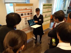 大阪大学吹田キャンパスで行われた、日本動物学会近畿支部主催・高校生ポスター研究発表会に、「ミミズ団子の核心に迫る」をテーマに研究を行っている国際理学科2年生が参加し、見事最優秀賞を受賞しました。小学生の頃から 10 年間ミミズについて探究し、観察し続けてきた集大成である研究について、大学の先生方からは「高校生らしい地道な研究」とお褒めいただき、非常に高い評価を受けました。