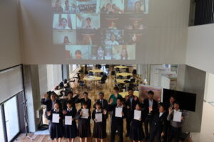 兵庫県内のSSH 校を中心とする9校、オーストラリアの高校2校、台湾の高校1校の生徒120名が参加したこのコンテストでは、20チーム のうち 、4チームが1次審査を通過し決勝に出場しました。本校からは2チームが決勝に出場し、 福島県へのトラベルプランを作成した本校の2年生2名、ロスモイン高校の生徒2名、台湾彰化女子高級中學の生徒2名からなるチームが優勝しました。副賞として優勝チームが 立てたプランである福島旅行が贈呈されます。