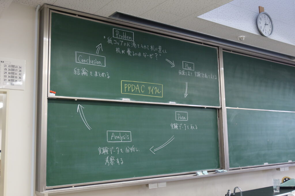 熱湯を注いだ紙コップを机に置き、数分後持ち上げると机に水滴がついている(曇っている)という現象について、班ごとに仮説を設定し、実験計画を立て、実験データをもとに考察・結論を考えるという一連のPPDACサイクルを経験しました。班ごとに出した考察・結論はワールドカフェ形式で他の班と共有しました。2時間の授業の中でどの班もPPDACサイクルを回すことが出来ました。