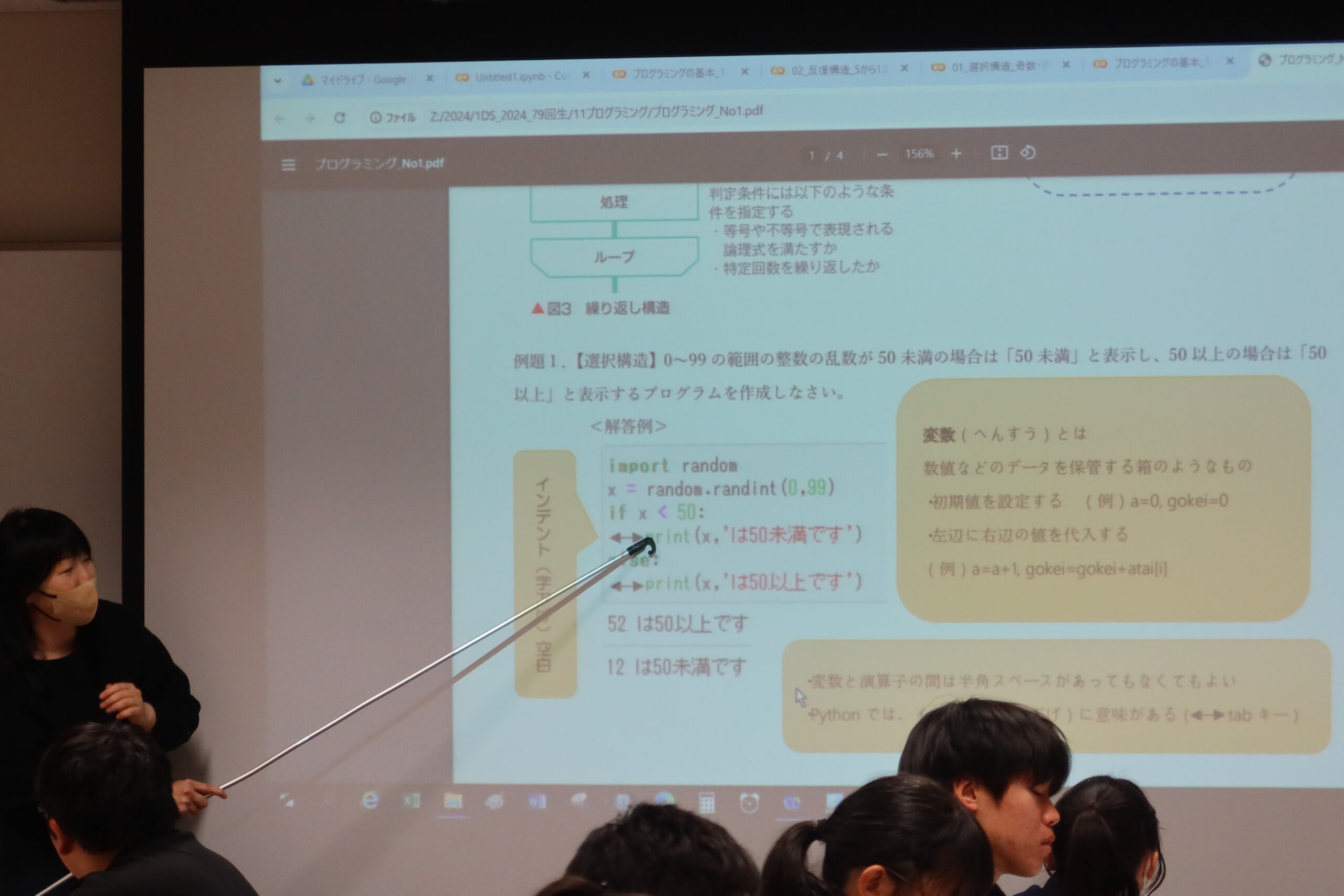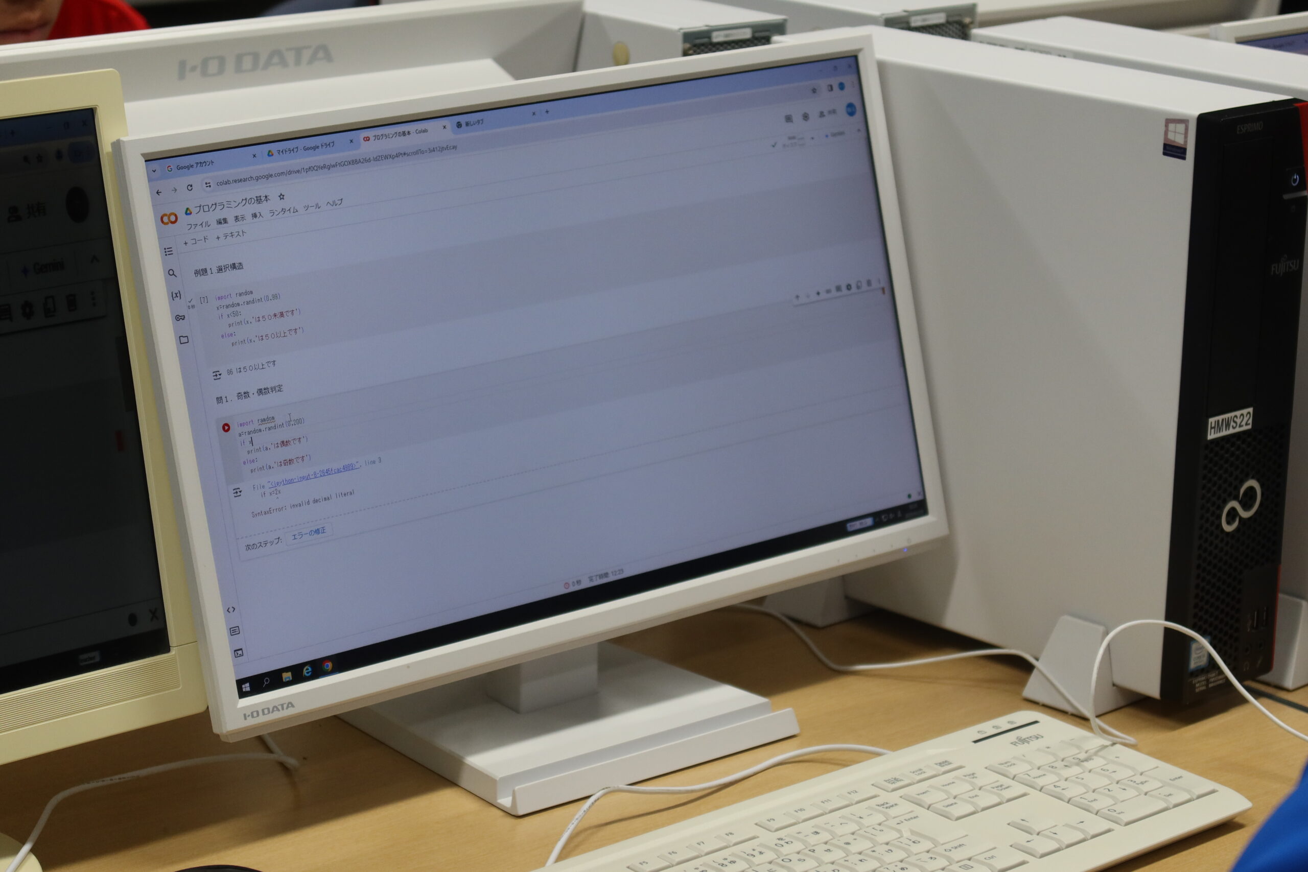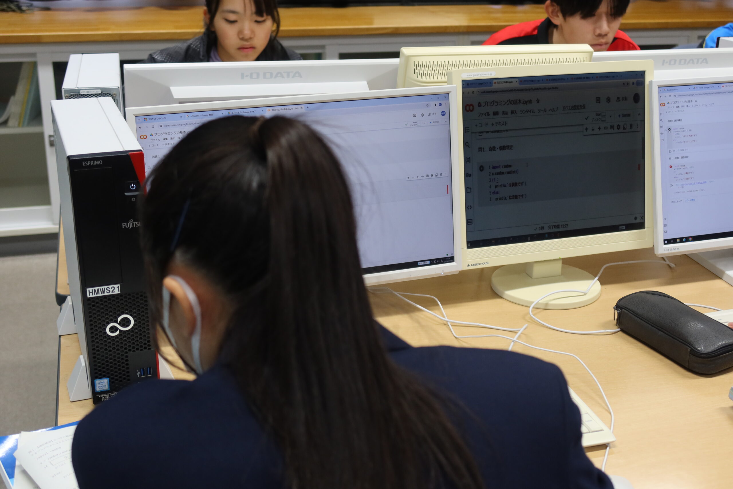 「Google Colaboratory」というグーグルの機能を使っています。聞きなれない用語も多いなか、生徒たちは悩みながらも四苦八苦しながら授業に取り組んでいました。