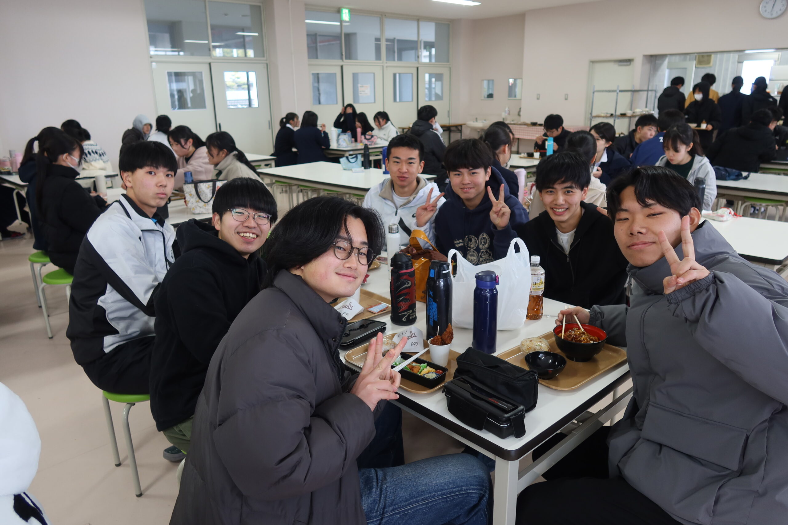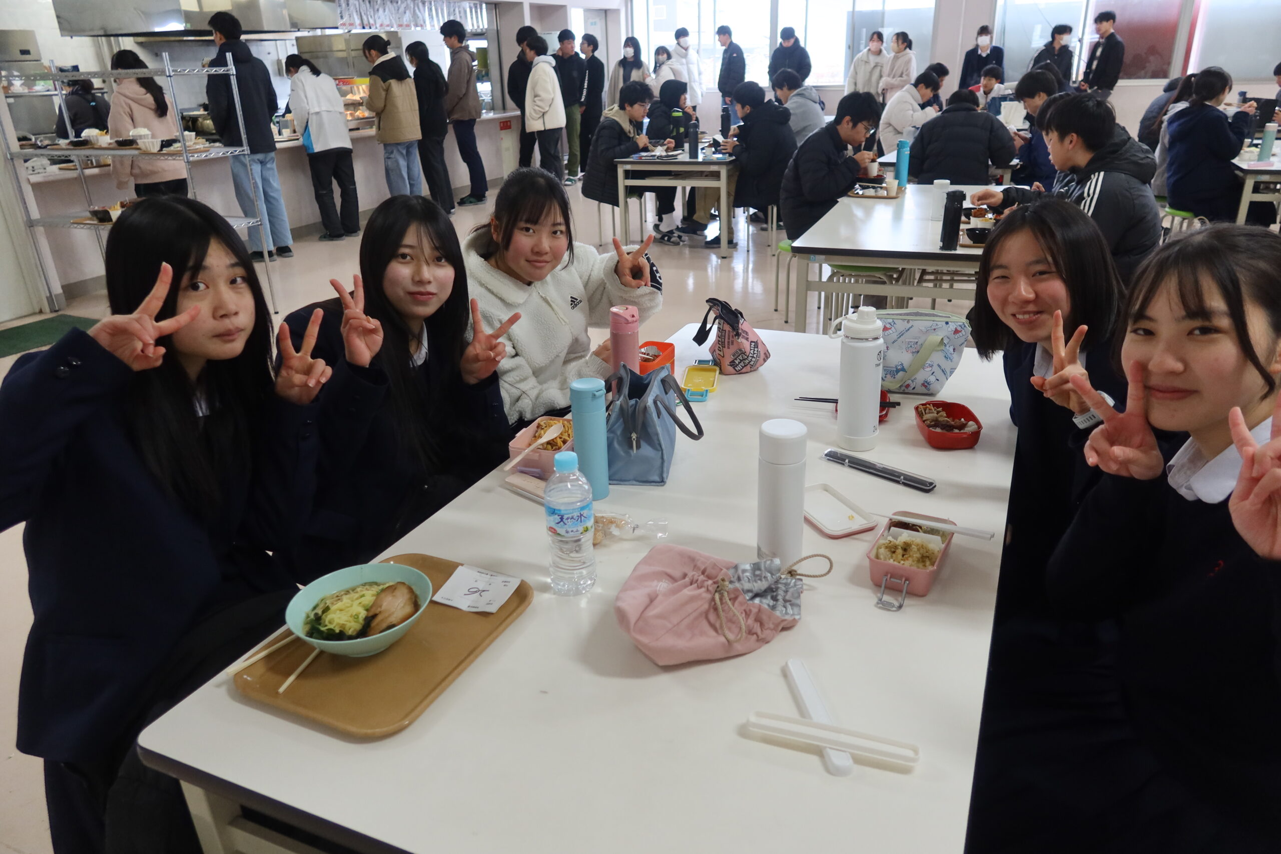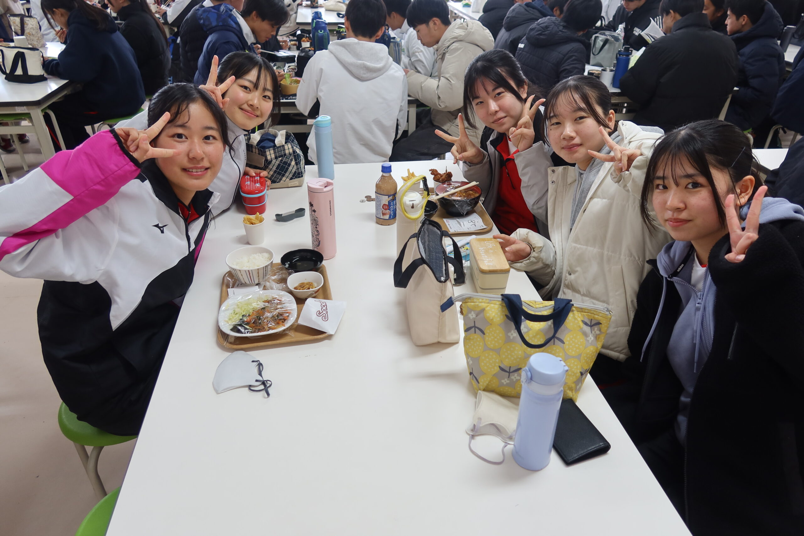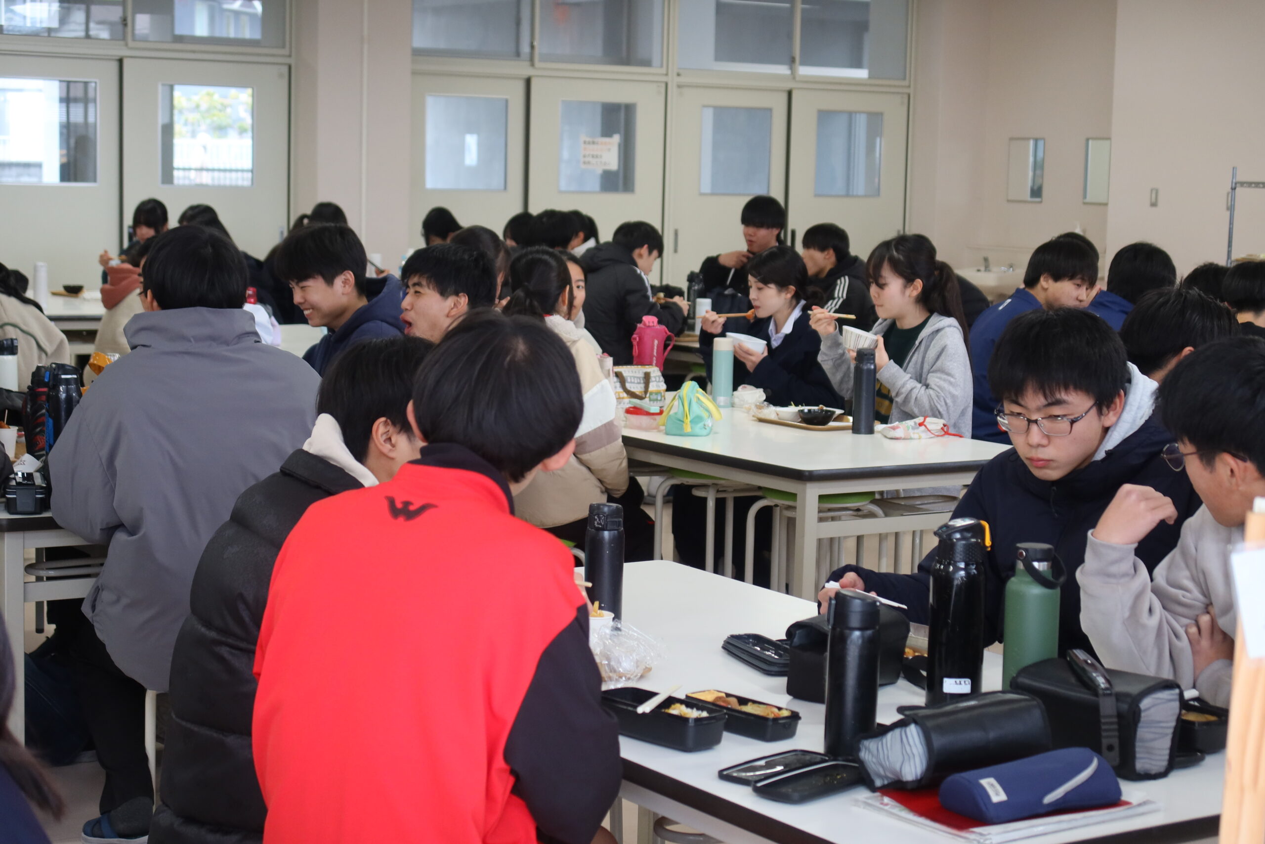 生徒たちは友達と一緒に楽しそうに昼食をとっています。