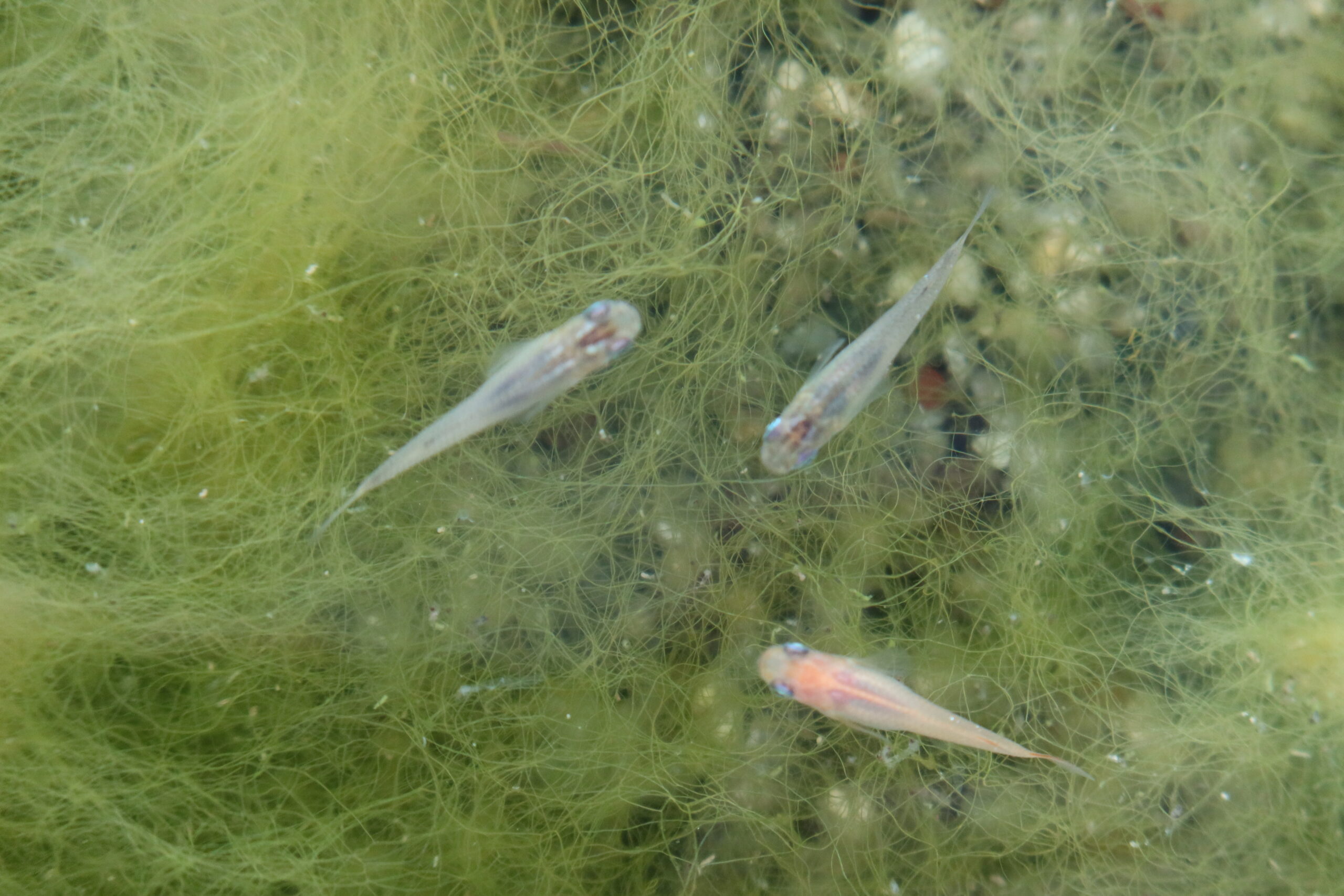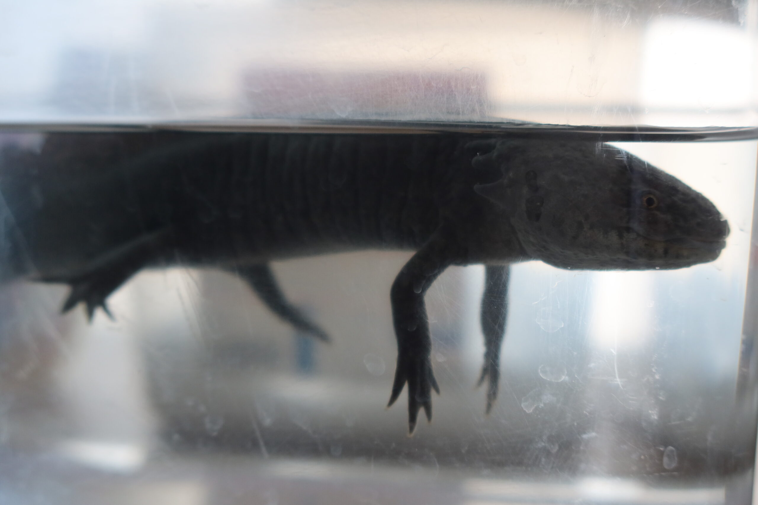 ウーパールーパーは生物部の生徒たちが生物教室で飼育しています。大人が2匹、赤ちゃんが2匹の計4匹います。