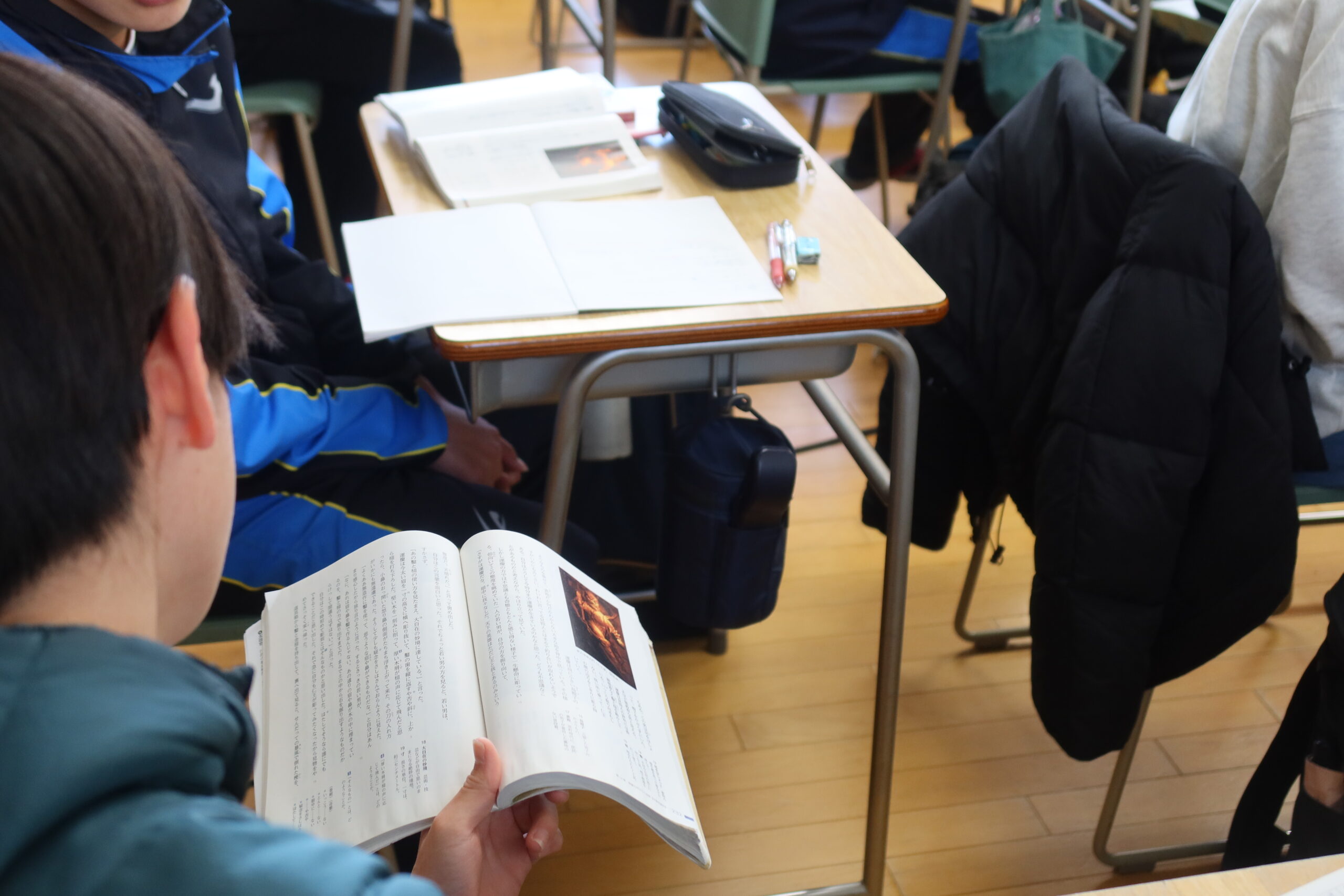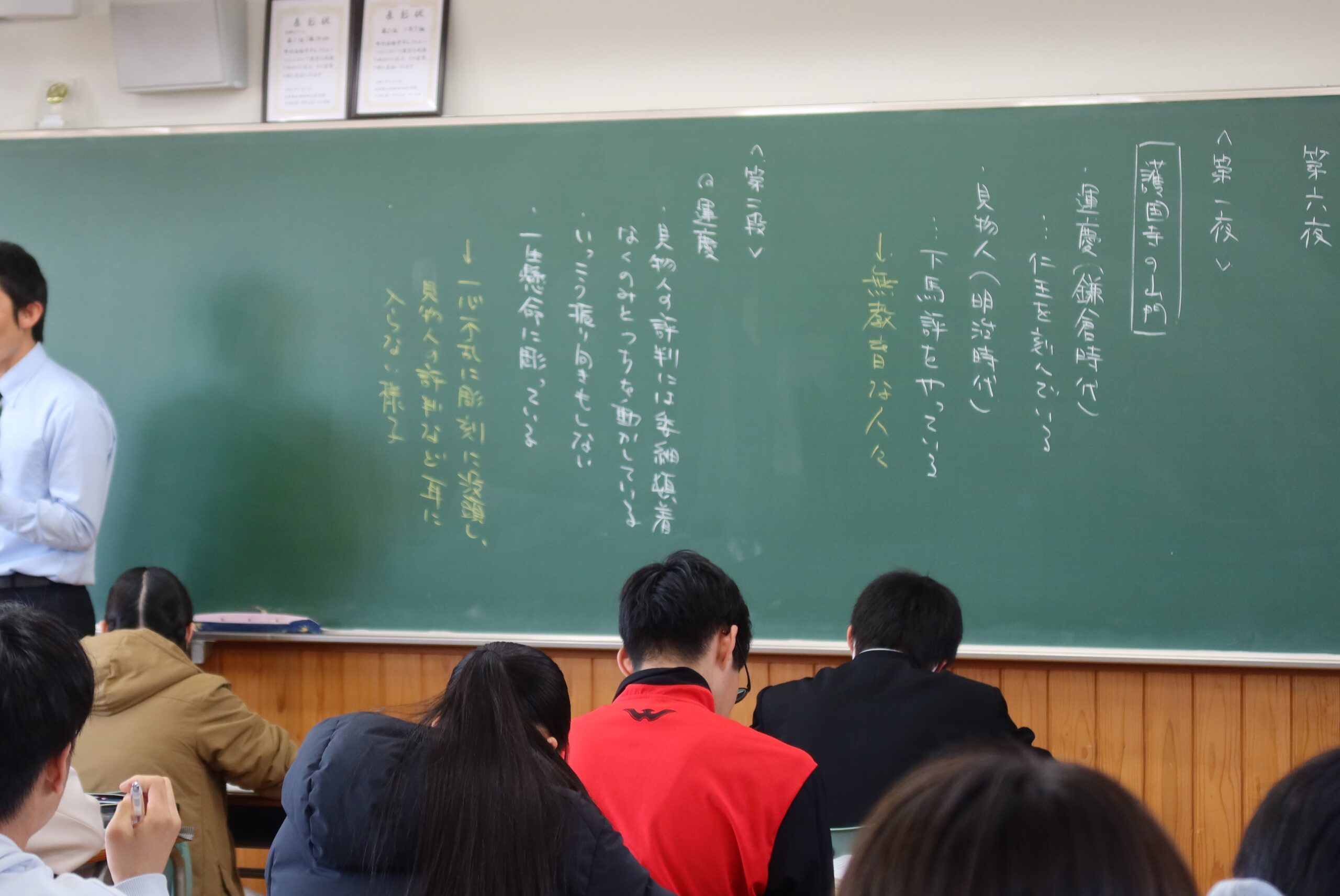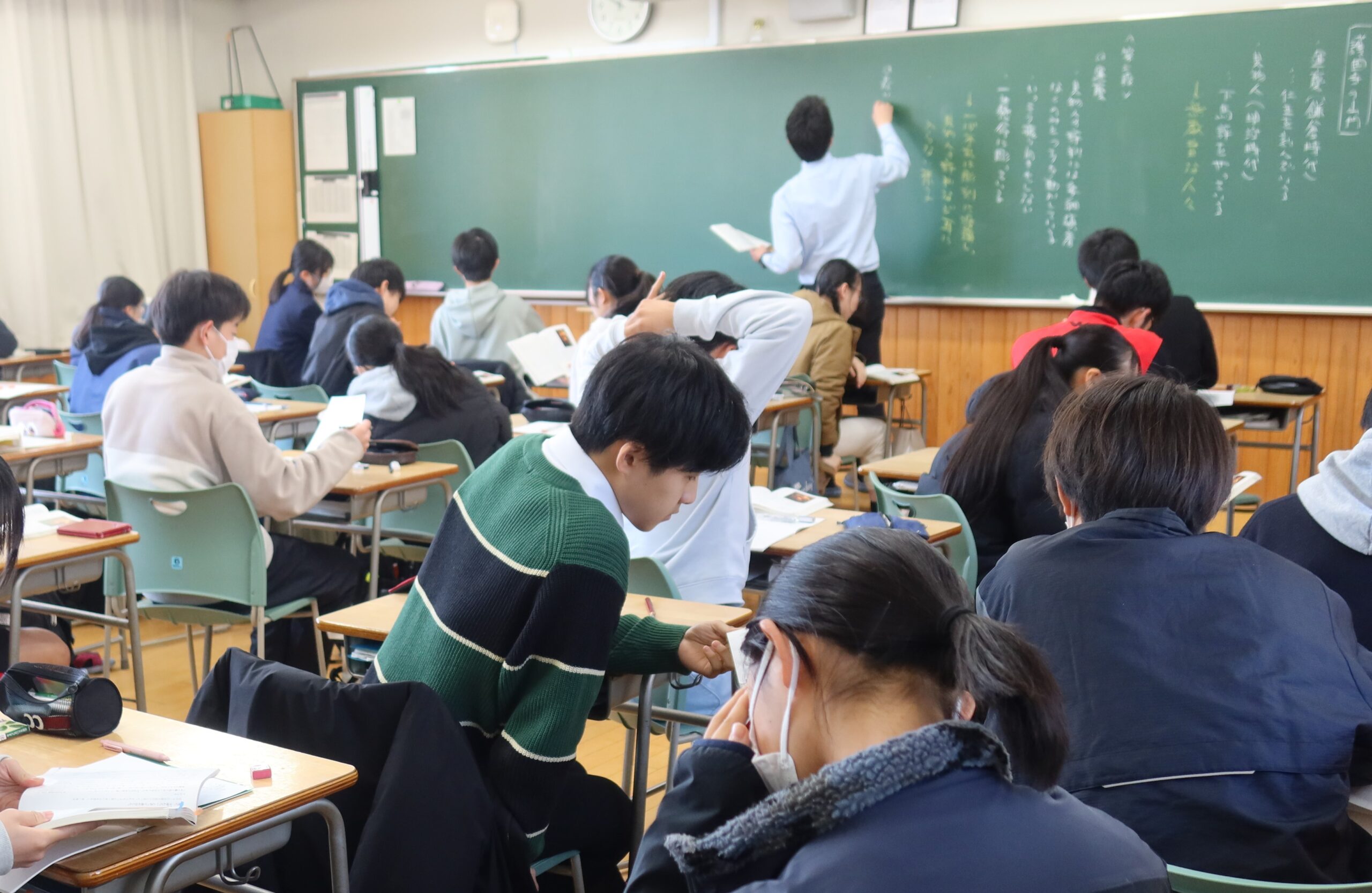 1年生がホームルーム教室で言語文化の授業を受けている様子です。