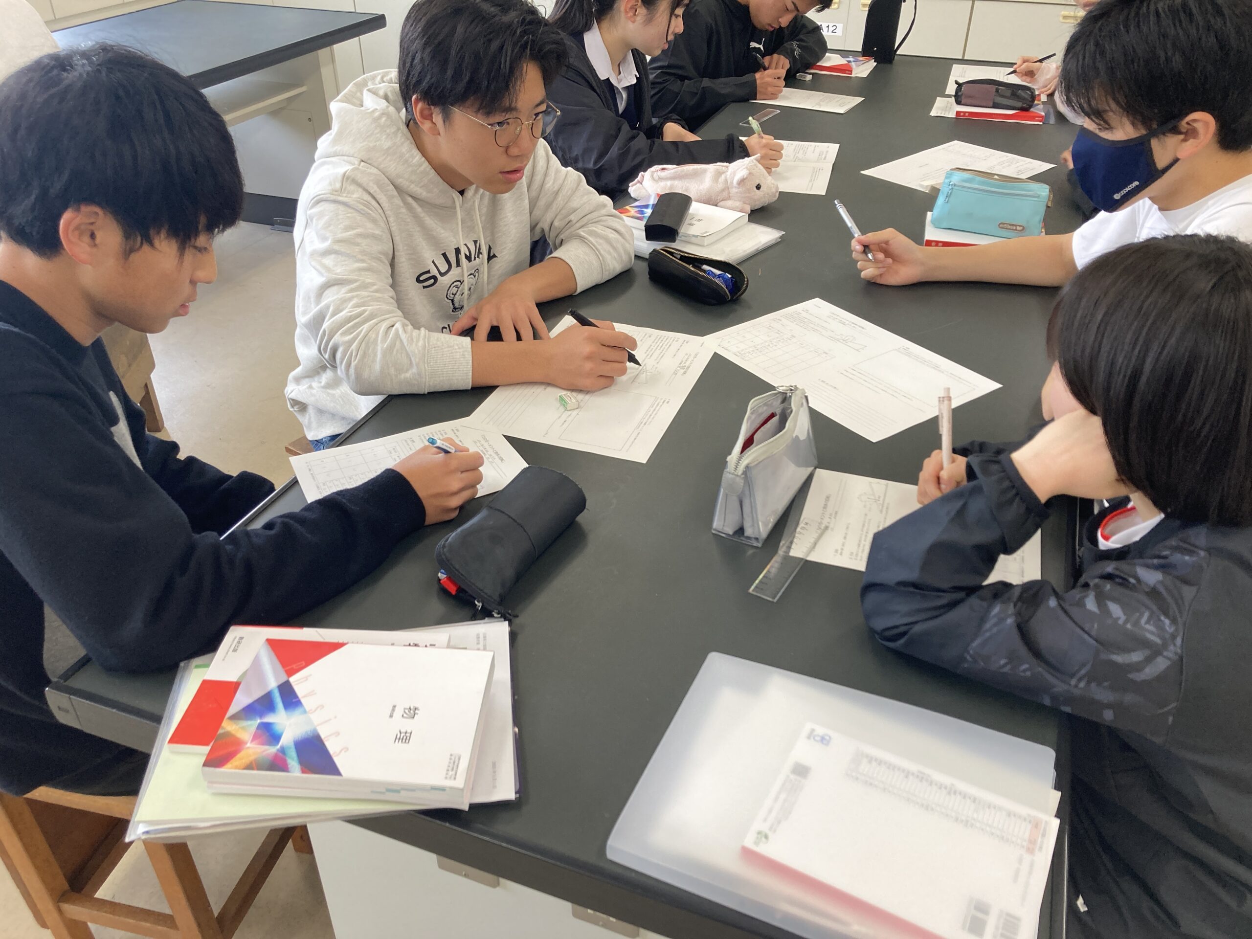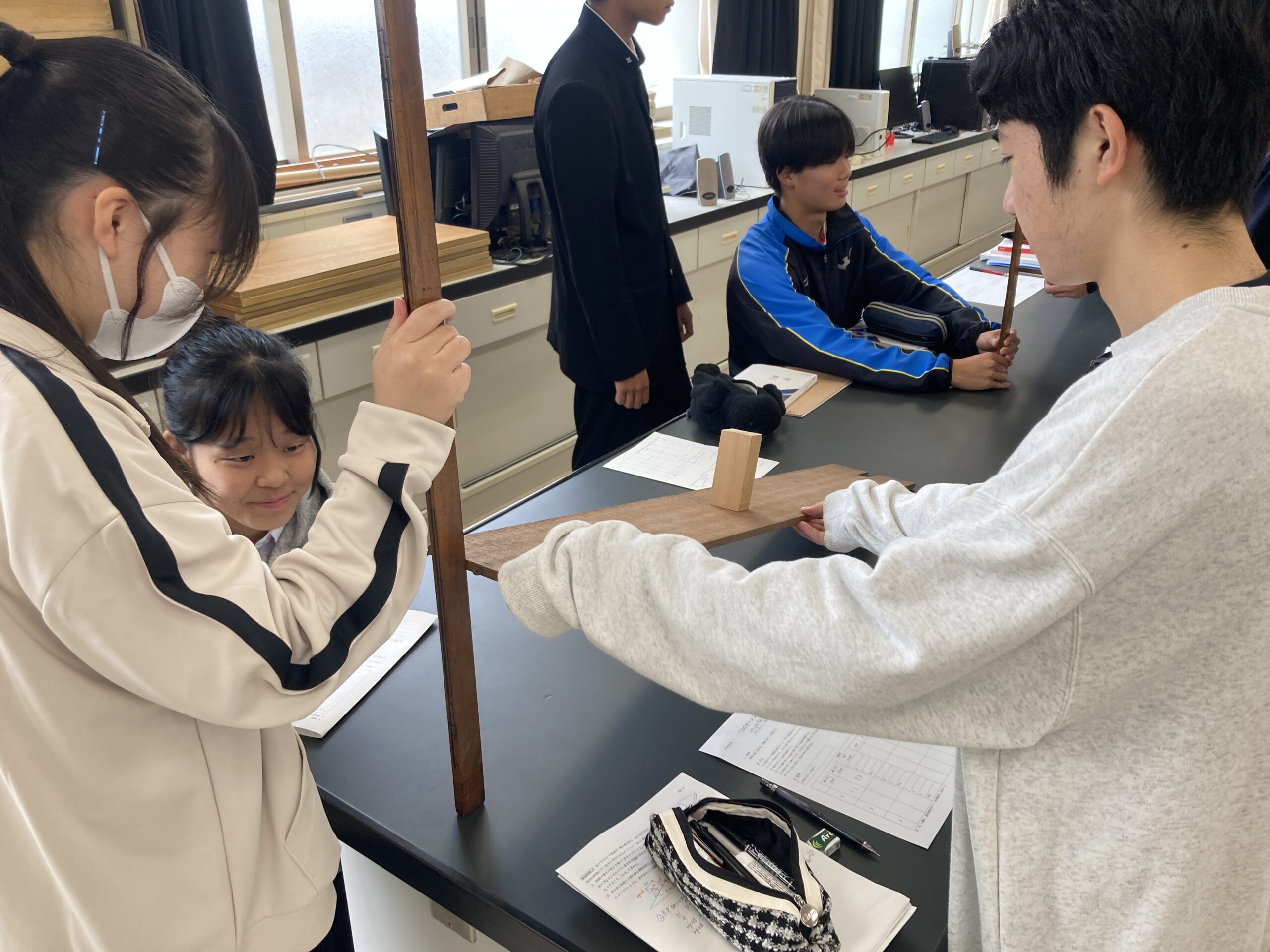板を徐々に傾けていき,板の上の木片がどのようなときに転倒するのかを,実験を通して学びました。なるべく「もの」を提示して演示しながら授業をしていますが,やはり実物を自分の手で動かしながら考えることに勝ることはないようです。