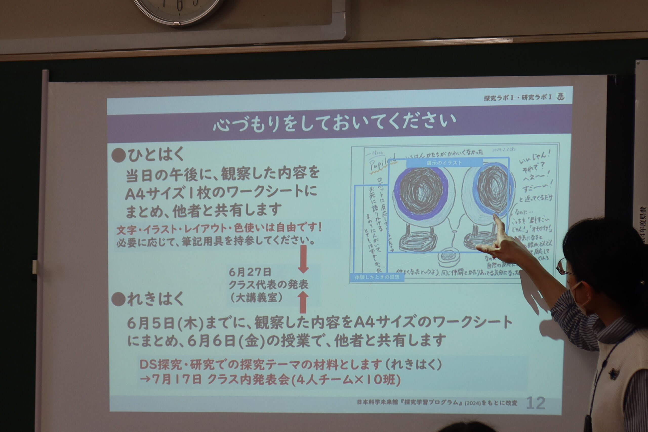 校内探検と同様に”見よう”と意識して見る事が大切です。わくわくする気持ちを大切に、自分は何に興味があるのかを考えて、ひとはく・れきはく探検では”なんとなく”気になったものを”とりあえず”記録していきましょう。